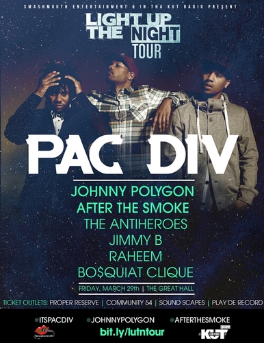 Pacific Division is a group out in California that I have blogged about in recent months and have been a listener of for about 4 years. They’ve been all over the place as they gradually continue to build up their name from the depths of the underground. Toronto is fortunate enough to play hosts to this tour (along with showing out our own talent) in the beginning of what is to be a great concert year for the city. Be sure not to miss out this one if you’re a Hip Hop fan. It’s going to be a great one. Tickets aren’t even that expensive, so why not? Check out their latest album, GMB (I reviewed it as well) and don’t be the one who says “man, I wish I could have gone” when everyone else talks about it the day and following days after. Give it a thought.