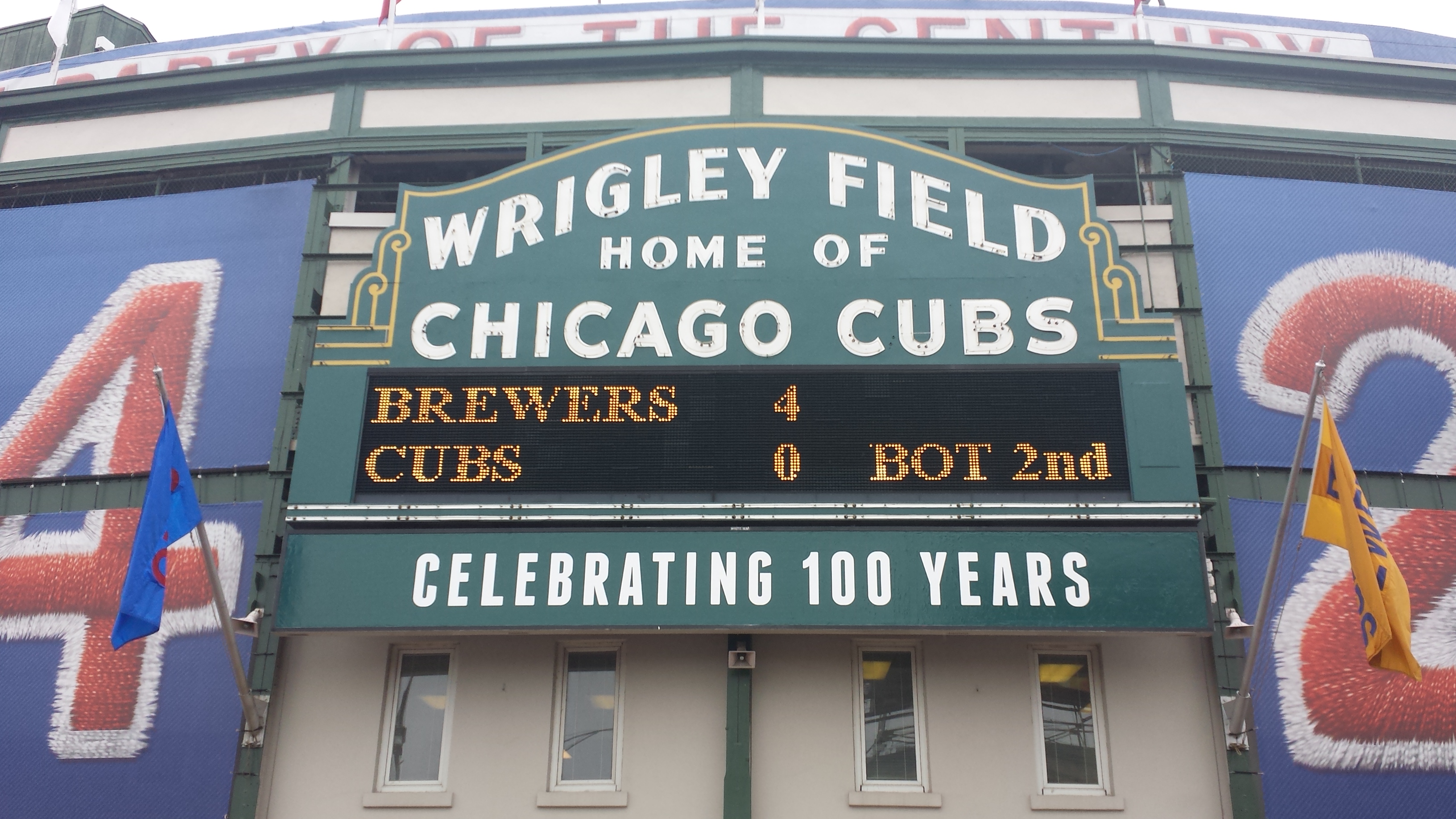But first we had to find tickets, and this is where scalpers are greatness. We paid $30 each for Level 100 seats, and as you can see by the photos the seats weren’t bad (I’m being modest). The craziest thing happened – the Cubs were down 4-0 in the bottom of the 2nd, and as we were walking to our seats the Cubs scored on a 2-run Homer by Darwin Barney, and then a solo run by Junior Lake came at the bottom of the 3rd. It was as if we were the good luck charm. Unfortunately the Cubs couldn’t pull off the win, and so Milwaukee took the game 4-3, but at least we were able to sit in the historic field as it was celebrating its 100th year. Pierce pointed out to me where the infamous Steve Bartman incident occurred, and although I’m not an avid baseball fan, I do remember watching that, and it was something of awe, the fact that the Cubs really haven’t been successful (playoff wise) since. That’s just a string of many curses on that team. Having watched the first round of Raptors/Nets Game 3 (with Mirna) and Game 6 outside through cold and rain at Maple Leaf Square, being outside with cold and rain at a baseball stadium was nothing we couldn’t handle, shivering and all.