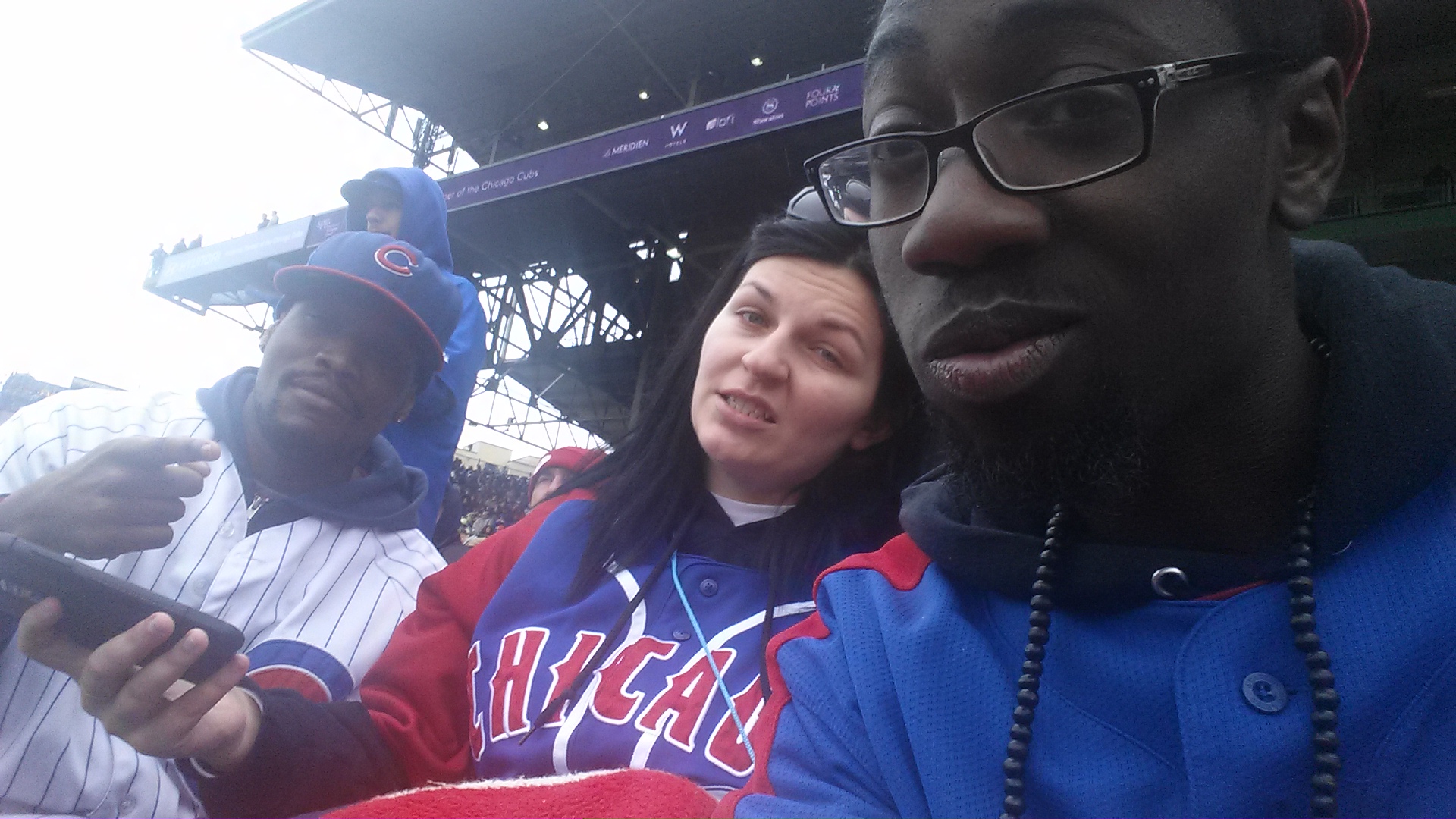 Friday was something else as well. For breakfast, Mirna, being the ever ambitious-always-finding-shit-on-her-phone-person, found a site through Pierce (grubhub) where she could order – wait for it – delivery…breakfast. I’ve never heard of such amenities in my entire existence of flesh. Unfortunately, the Kanye West line of ‘late as a motherf*cka, colored people time’ proved to be true, as we waited almost 2 hours for breakfast, and ideally we wanted to get down to Wrigley for 1pm – it was Noon when we finally got it. A little hiccup, but the food was delicious as ever and thus the day was set. Pierce came over to our spot and handed us Cubs jerseys and fitted caps with the logo bearing down (you saw what I did there). “If you’re going to a Cubs game, you might as well look the part,” to which Mirna and I both agreed. Green Line -> Red Line -> Addison. Boom. Wrigley.